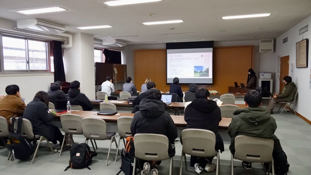 11月の第1次選考を経た最終案がプレゼンされた。今回は、須坂市社会共創部や建築士会の方にも加わっていただき、各々の案にて質疑も交わされた。最優秀案は2月の成果発表会にて公表され、百々川公園に設置される。受講者が昨年度の約2倍と多かったせいか、熱量も高く感じられた。